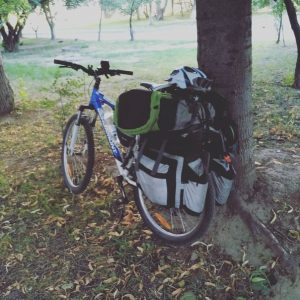 Знайшли місце на широкій галявині з бесідками і столиками, а знизу в обриві шуміла широка річка. Розклали палатку, зчепили велосипеди і заснули солодким сном, шум річки заколисував. Вирішили спати скільки захочеться, ця обставина була дуже незвичною для нас так як постійно потрібно кудись спішити і бігти. Проснулась я, спитала Богдана котра година (вже була пів десята) і знову заснула, шум річки ніби заголублював і заколисував. Знову прокинулась через деякий час і тут такий сюрприз у вигляді приготовленого сніданку! Це так було приємно! Умм, вівсяна каша, бутерброди, чай, шоколад. Швидко зібрали палатку і речі, поснідали і тут почули голос Богдана Д.