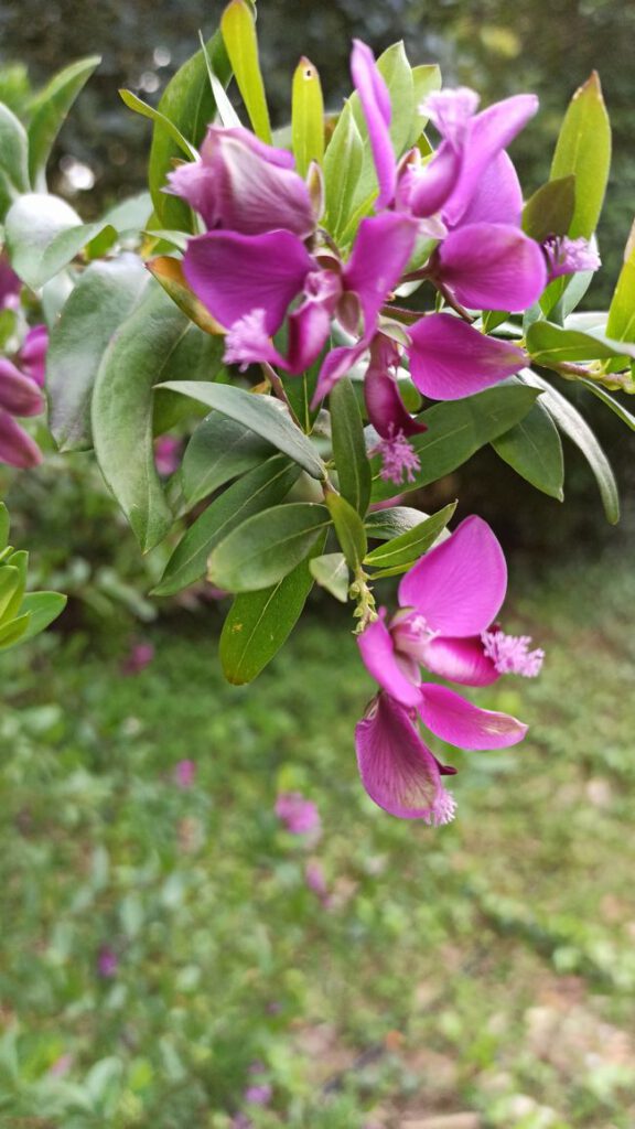 Сподобався кущ «полігала миртофолія», квіти рожево-фіолетового кольору, а листя з голками.